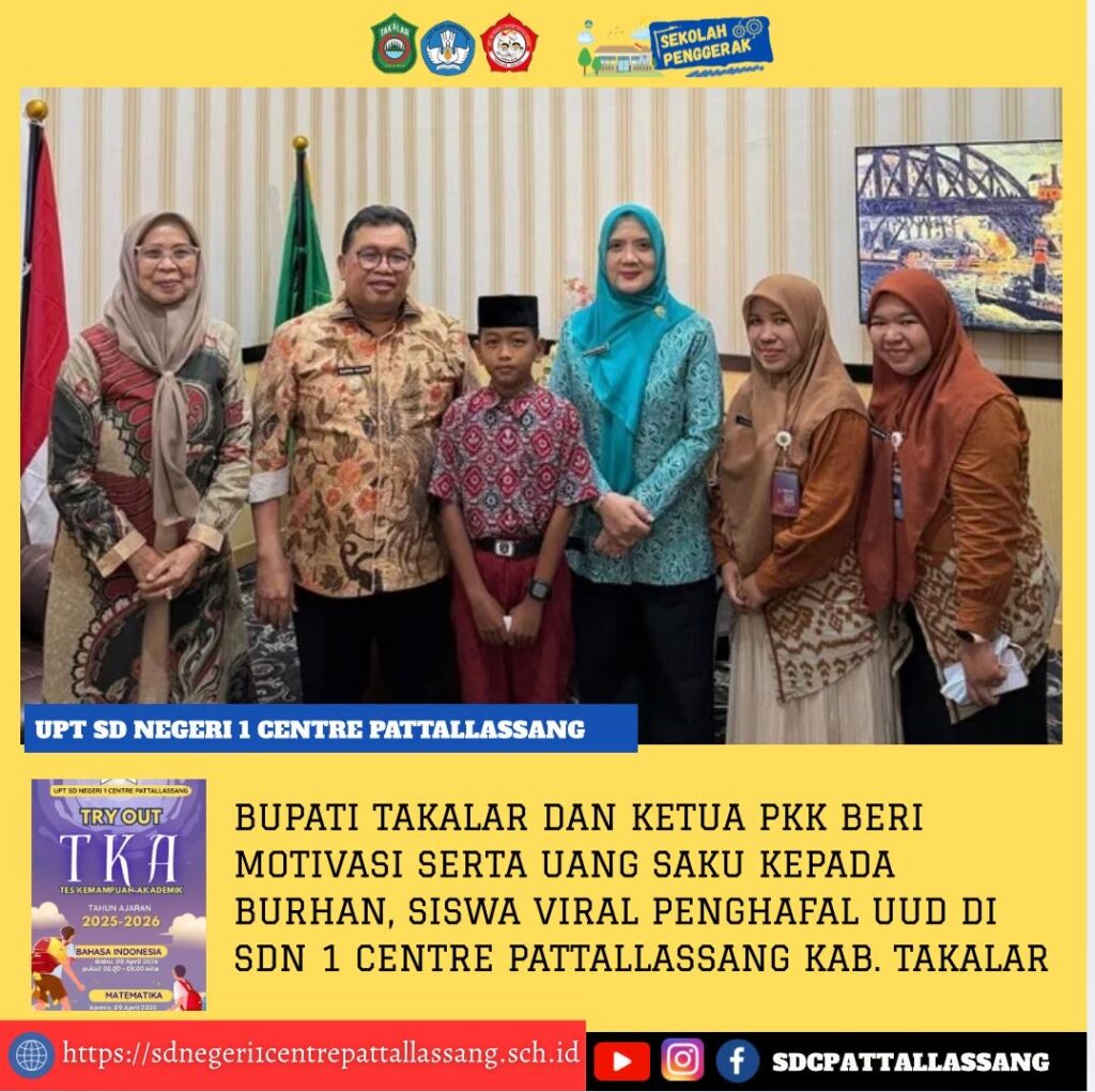 Takalar – Jumat, 10 April 2026:; Prestasi membanggakan kembali ditorehkan oleh siswa UPT SD Negeri 1 Centre Pattallassang. Burhan Sabir Sabri Nursyamsu, siswa yang viral karena kemampuannya menghafal dan melantunkan Undang-Undang Dasar 1945 dengan penuh percaya diri saat upacara bendera di sekolahnya, mendapat perhatian khusus dari Bupati Takalar, Mohammad Firdaus Daeng Manye, bersama istri beliau, Dewi Sri Ekowati Firdaus.