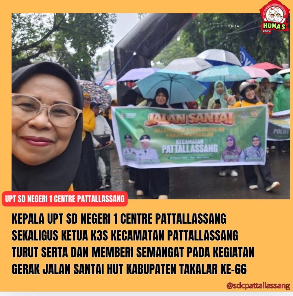 Takalar, minggu 7 Januari 2026 :; Dalam rangka memeriahkan Hari Ulang Tahun (HUT) Kabupaten Takalar ke-66, Kepala UPT SD Negeri 1 Centre Pattallassang yang juga menjabat sebagai Ketua Kelompok Kerja Kepala Sekolah (K3S) Kecamatan PattallassangIbu Dra. Siswaty M, turut hadir sekaligus ambil bagian secara langsung dalam kegiatan Gerak Jalan Santai yang diselenggarakan pada Sabtu, 7 Februari 2026.