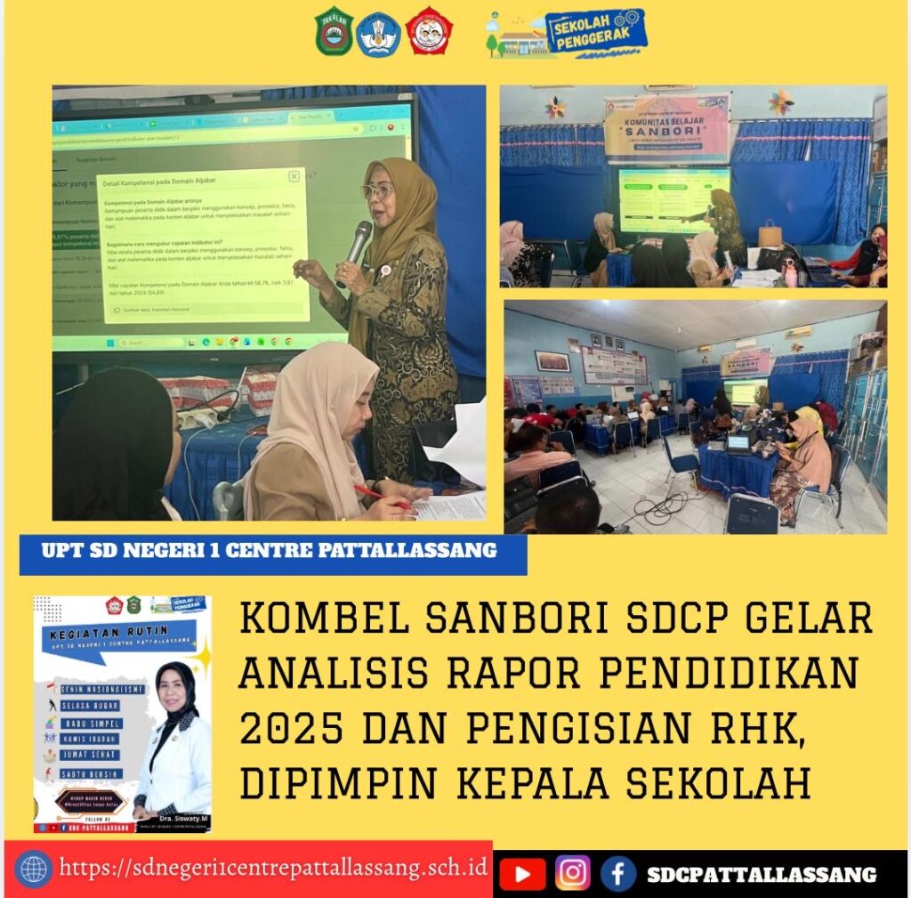 Takalar, Sabtu 11 April 2026:; UPT SD Negeri 1 Centre Pattallassang kembali menunjukkan komitmennya dalam meningkatkan mutu pendidikan melalui kegiatan KOMBEL SANBORI (Komunitas Belajar). Kegiatan ini difokuskan pada Analisis Rapor Pendidikan Tahun 2025 yang melibatkan seluruh warga sekolah, mulai dari guru, staf, hingga perwakilan orang tua. Kegiatan tersebut dipimpin langsung oleh Kepala Sekolah, Dra. Siswaty M.