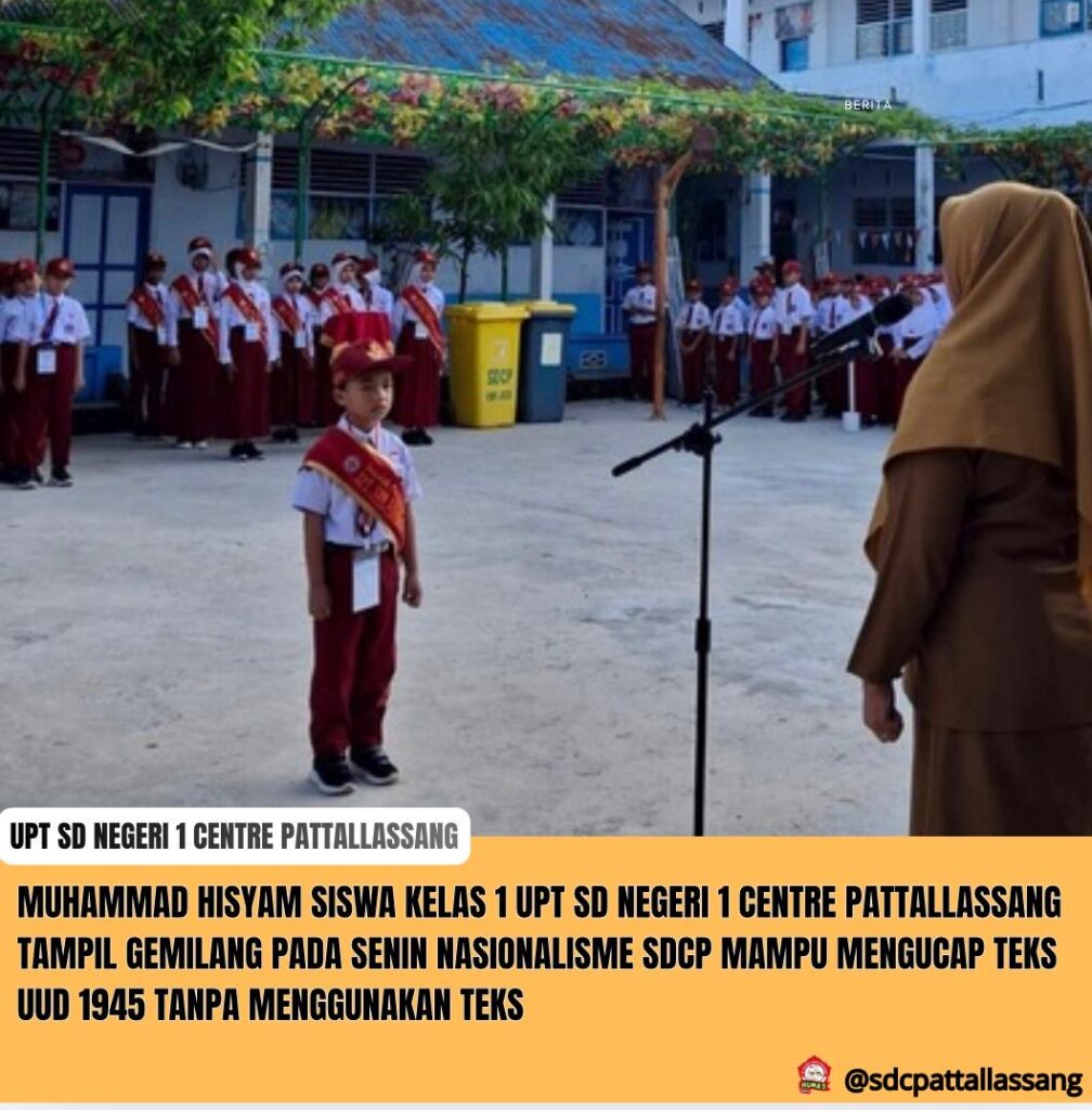 Takalar, Senin, 26 januari 2026 :; Pelaksanaan Senin Nasionalisme SDCP yang dirangkaikan dengan Upacara Bendera di UPT SD Negeri 1 Centre Pattallassang kembali berlangsung dengan tertib, khidmat, dan sarat nilai pendidikan karakter. Kegiatan rutin ini tidak hanya menjadi sarana pembiasaan disiplin dan cinta tanah air, tetapi juga menjadi wadah untuk menumbuhkan keberanian, kepercayaan diri, serta sikap saling menghargai di lingkungan sekolah.