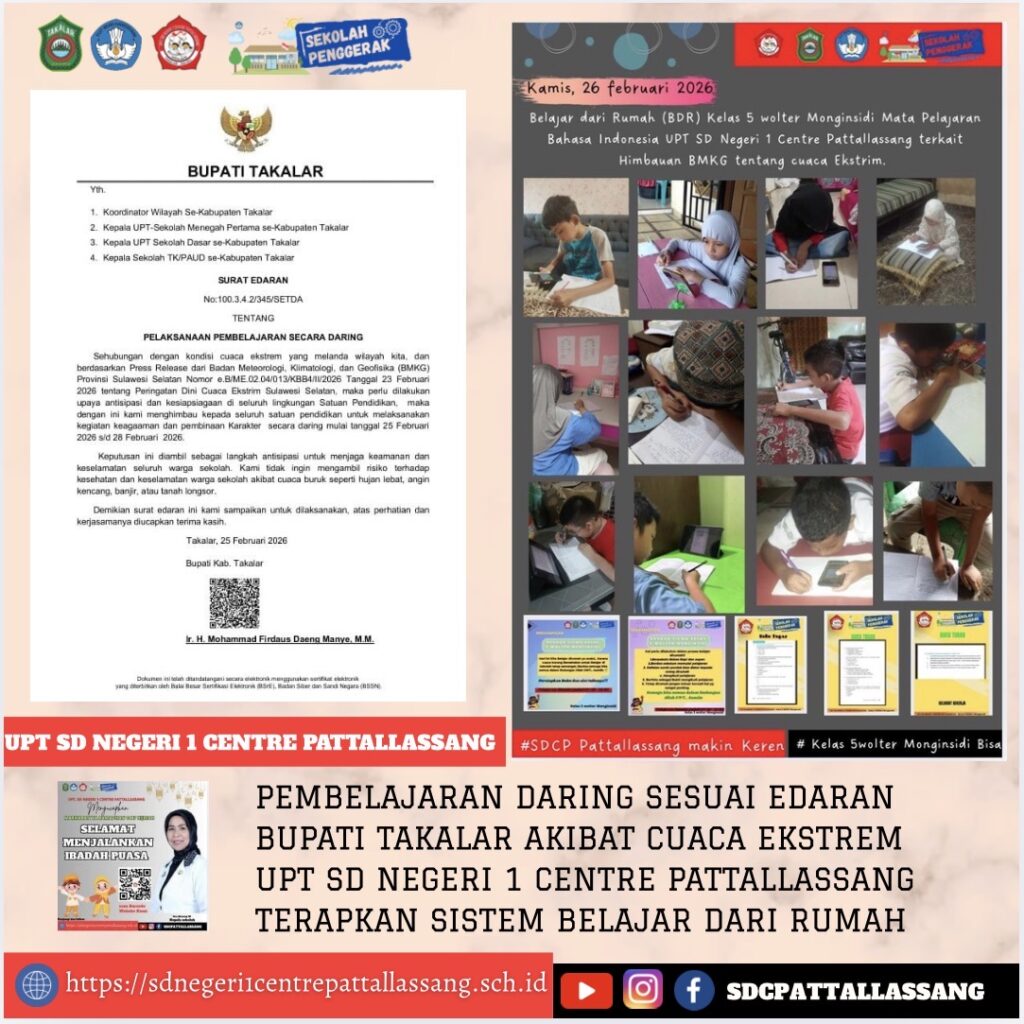 Takalar…Kamis, 26 Februari 2026:; Menindaklanjuti Edaran Bapak Bupati Kabupaten Takalar terkait pelaksanaan pembelajaran secara daring akibat kondisi cuaca ekstrem yang melanda wilayah Takalar dan sekitarnya, UPT SD Negeri 1 Centre Pattallassang resmi memberlakukan sistem Belajar dari Rumah (BDR) mulai tanggal 25 hingga 28 Februari 2026.