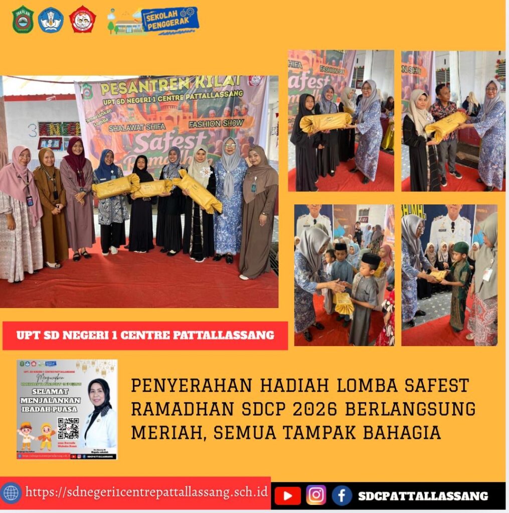 Takalar, Sabtu. 14 Maret 2026 :; Keceriaan dan kebahagiaan tampak menghiasi kegiatan SAFEST Ramadhan SDCP 2026 di UPT SD Negeri 1 Centre Pattallassang. Pada kesempatan tersebut, Kepala UPT SD Negeri 1 Centre Pattallassang, Ibu Dra. Siswaty M, secara langsung menyerahkan hadiah kepada para pemenang lomba Fashion Show Ramadhan dan Shalawat Syifa yang telah dilaksanakan dalam rangka memeriahkan kegiatan Ramadhan di sekolah tersebut.